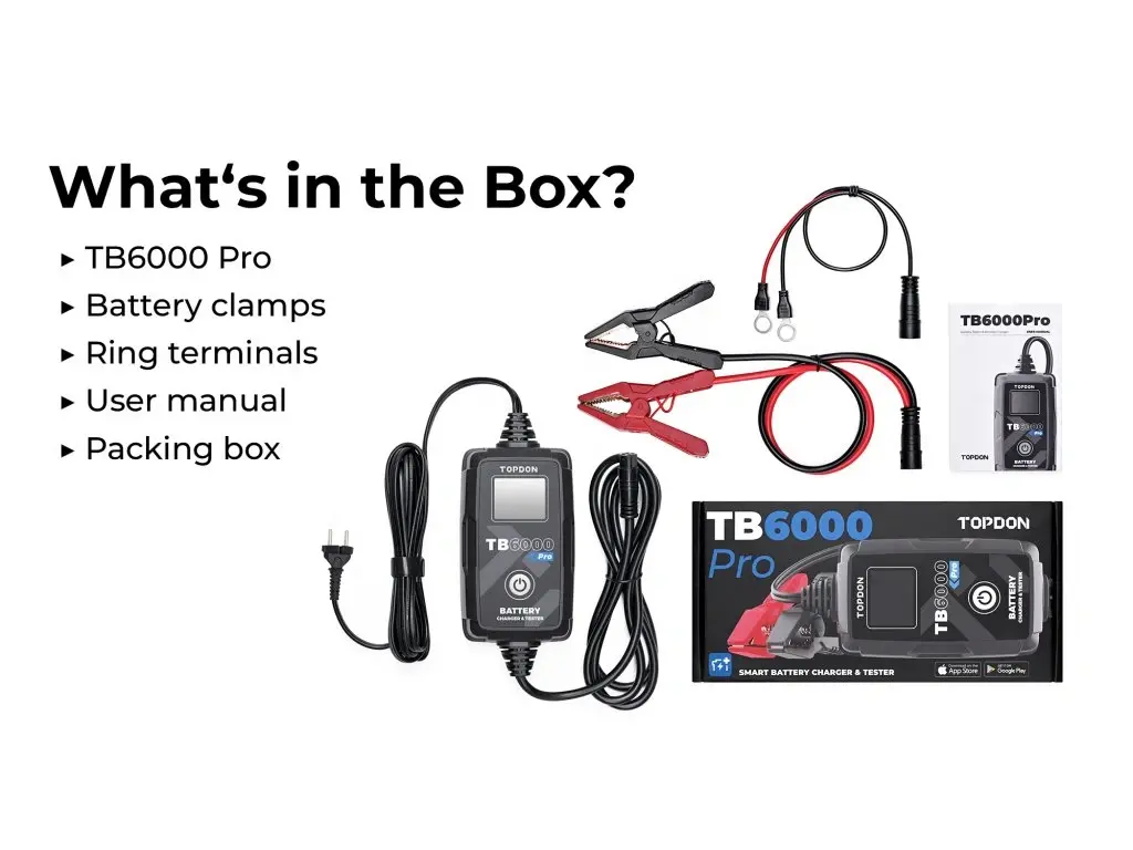 TB6000Pro je najnovší tester a nabíjačka 6V a 12V akumulátorov s intuitívnou aplikáciou od firmy TOPDON. Presne zmeria štartovací prúd pri studenom štarte, stav batérie a diagnostikuje bežné závady štartovacieho a dobíjacieho systému.