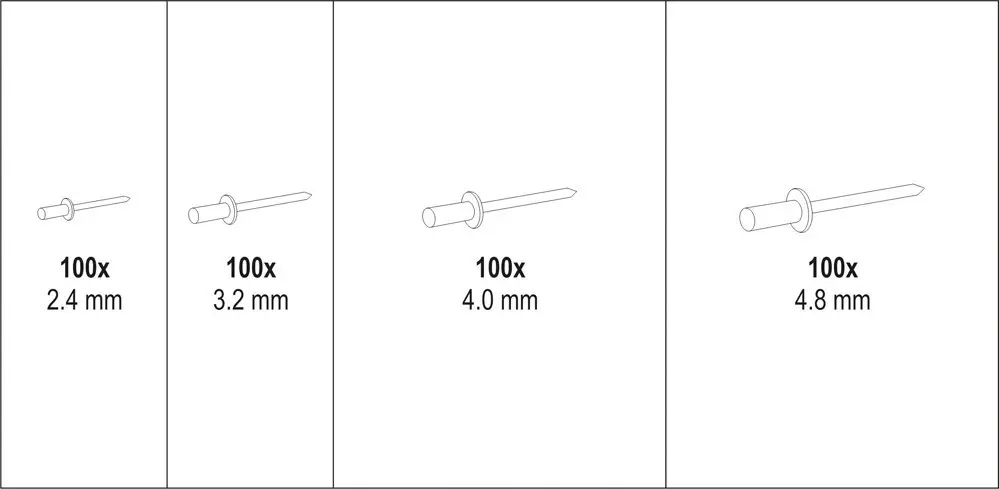 Trhacie hliníkové nity, sada 400ks (2,4; 3,2; 4,0; 4,8 mm) - YT-36420