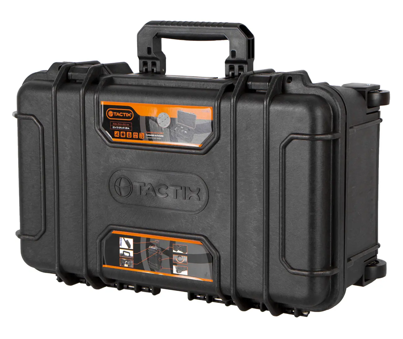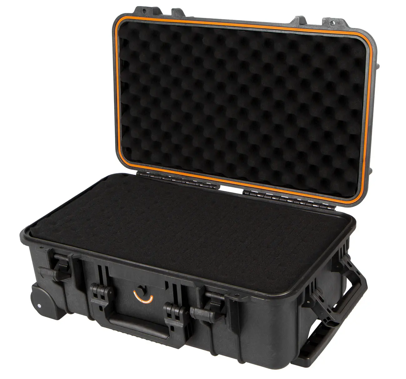 Vodotesný plastový kufor s predrezanou penovou výplňou a kolieskami. Rozmery: 558 x 352 x 232 mm.