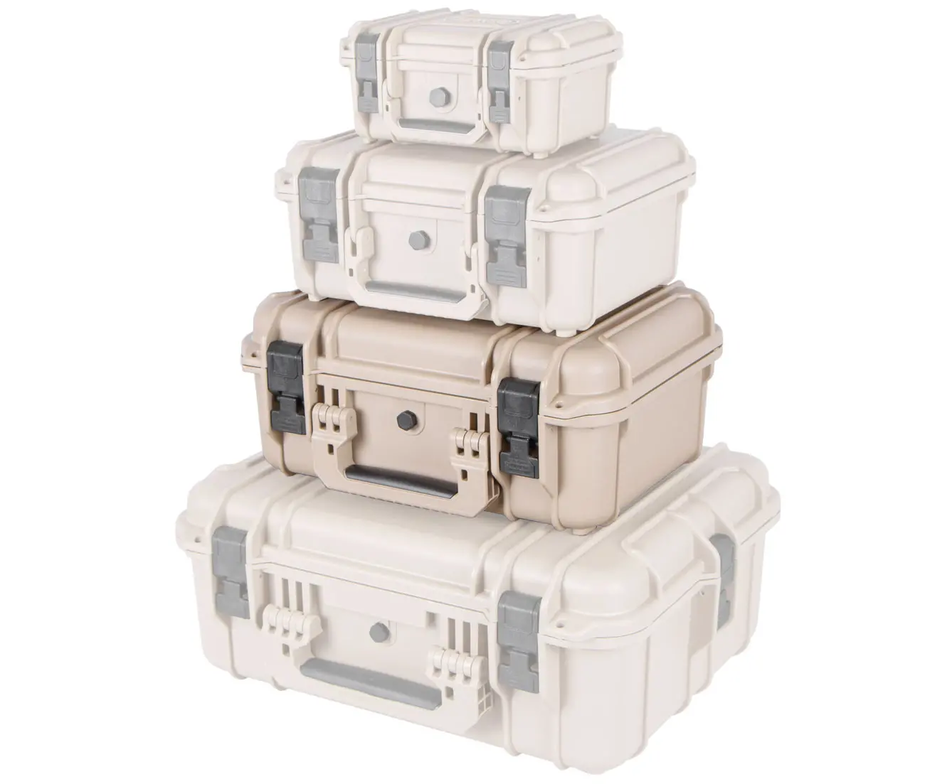 Vodotesný plastový kufor v béžovej farbe, na rôzne druhy krehkého náradia a vybavenia.