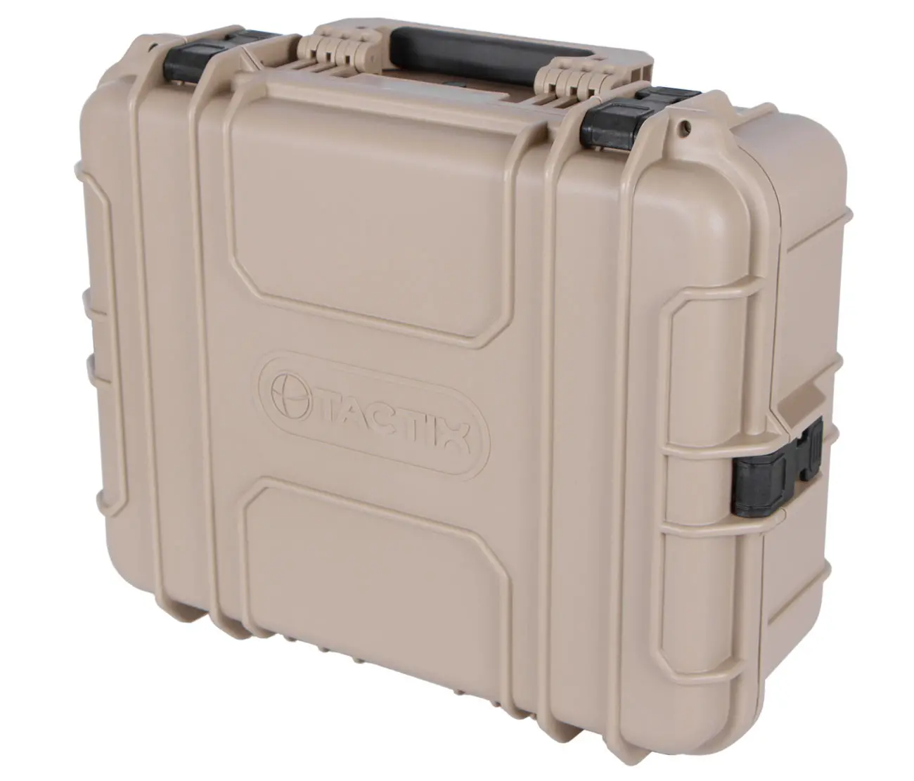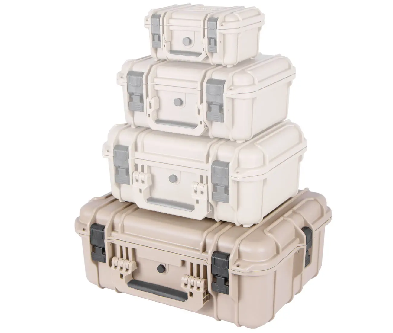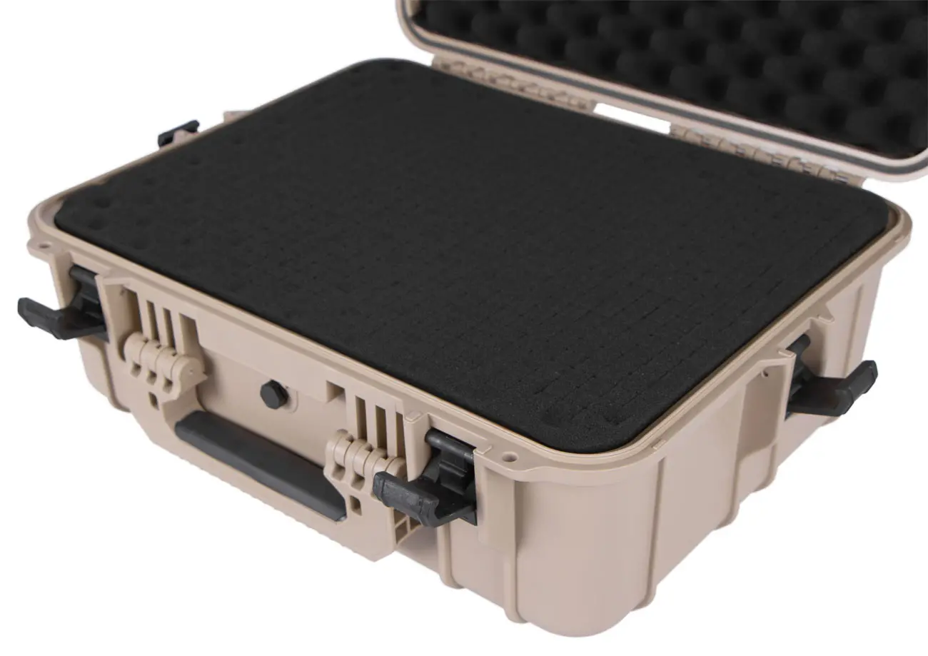 Vodotesný plastový kufor v béžovej farbe, pre rôzne druhy náradia a vybavenia.