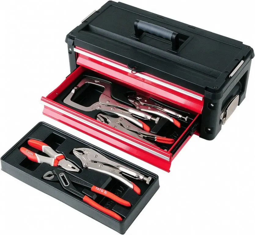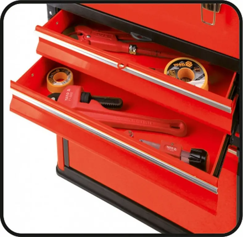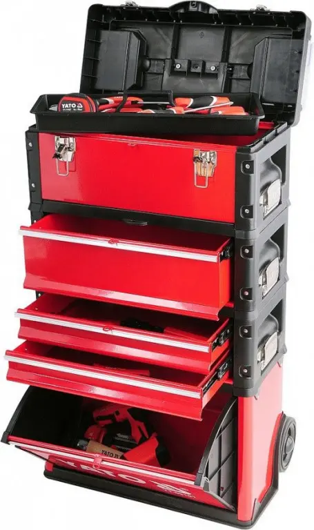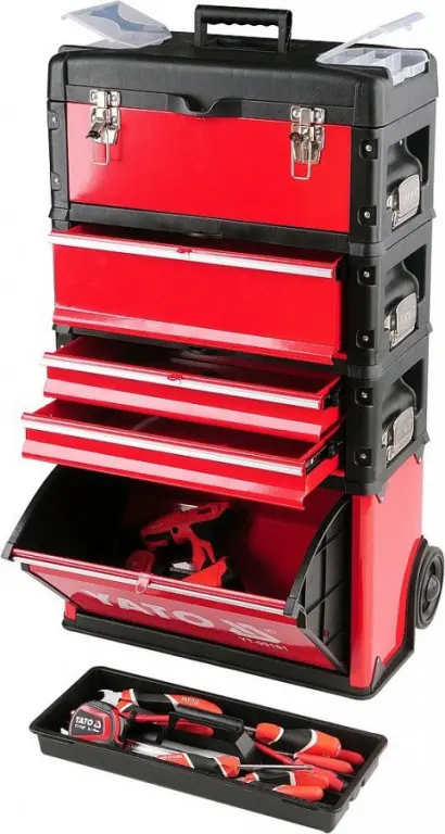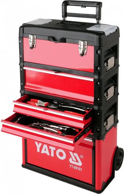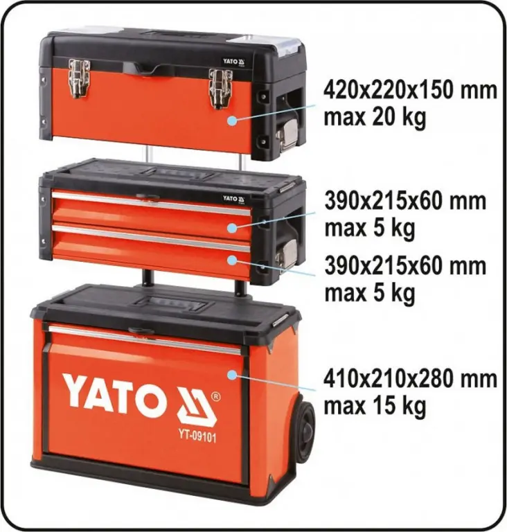 Modulárna skriňa / box na náradie - 3-dielna. Súprava sa skladá z hlavného modulu, kde nájdeme vstavané kolesá, teleskopickú hliníkovú rukoväť. Nosnosť hlavného modulu je 15kg a rozmery 410x210x280mm. Stredný modul má 2 kovové zásuvky s nosnosťou 5kg a rozmer jednotlivej zásuvky je 390x215x60mm. Do týchto zásuviek je možné vložiť vložky s náradím YATO. Zásuvky sú na kovových guličkových ložiskách. Horný modul je klasický s horným vekom s rozmermi 420x220x150mm a nosnosťou 20kg. Má vstavané 2 malé organizátory a vnútri vložku na náradie. Má rovnú hornú plochu, ktorá môže slúžiť ako pracovná doska. Navyše majú drážku, ktorá je veľmi užitočná pri vŕtaní alebo skrutkovaní. Okrem toho, že moduly sú vybavené komfortnou a protišmykovou rukoväťou a bočnou rukoväťou pre ľahké zdvíhanie majú tiež protišmykové dolné hrany rohov. Skriňu môžete rozšíriť o ďalší modul pridaním modulu YT-09107 alebo YT-09108. Moduly majú horné a stredné kovové istenie medzi sebou.