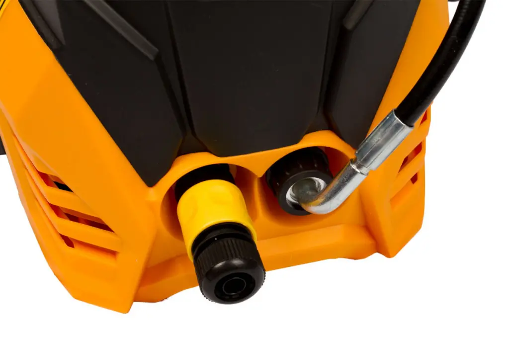 V spodnej časti potom prívod vody do vapky so skrutkovaním 1", teda 1 coul, ku ktorému v balení nájdete plastovú záhradnú rýchlospojku (samec i samica). Vo vnútri prívodu je plastové sitko pre zachytenie hrubých nečistôt. Pri čelnom pohľade sa prívod nachádza vľavo. Vpravo sa naopak nachádza vysokotlakový vývod pre napojenie vysokotlakovej hadice so skrutkovaním 21,7 mm.