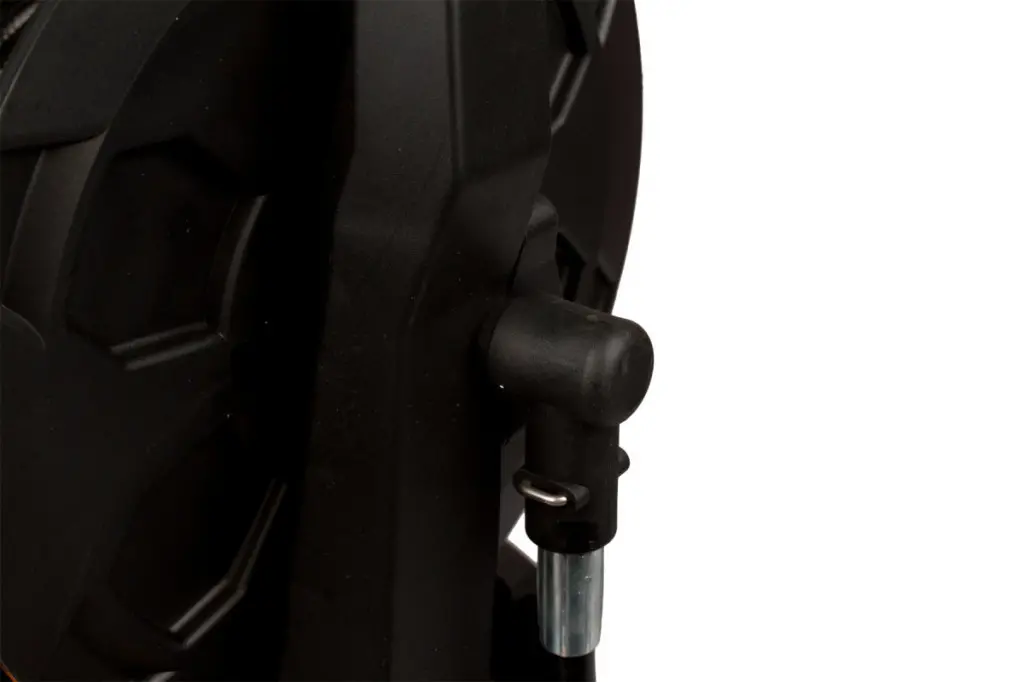 Na ľavom boku je vyvedený prívod elektrického káblu o dĺžke 5 m a na pravom boku odložný držiak vysokotlakovej pištole (len pri kompletnom zapojení pištole). A u pätky sú na stranách transportné kolieska.
