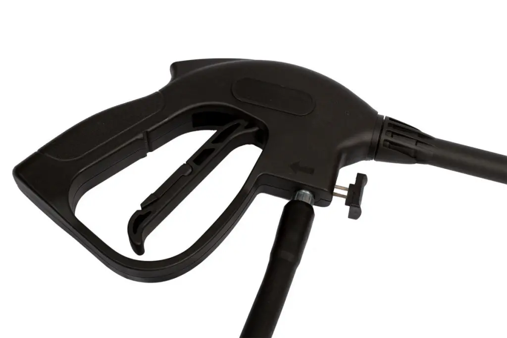 Pred spúšťou je ochranný oblúk, ktorý chráni prsty a pred ním je rýchlospojka pre pripojenie vysokotlakovej hadice s jednoduchým odpojovacím tlačidlom (pozor - dodržujte pokyn pre rozoberanie - po vypnutí vapku "odtlakujte").
