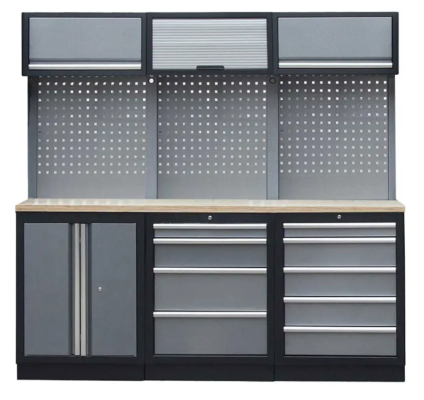 Zostava nábytku v sebe skrýva dostatočné množstvo úložného priestoru pre vaše náradie, autotechniku aj dielenské vybavenie. V kombinácii s robustnou pracovnou doskou získate multifunkčnú stenu, s ktorou vám pôjde práca od ruky vo všetkých smeroch.