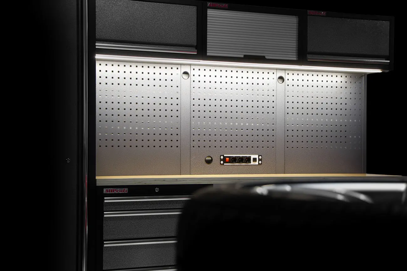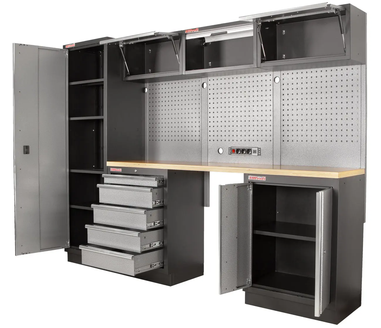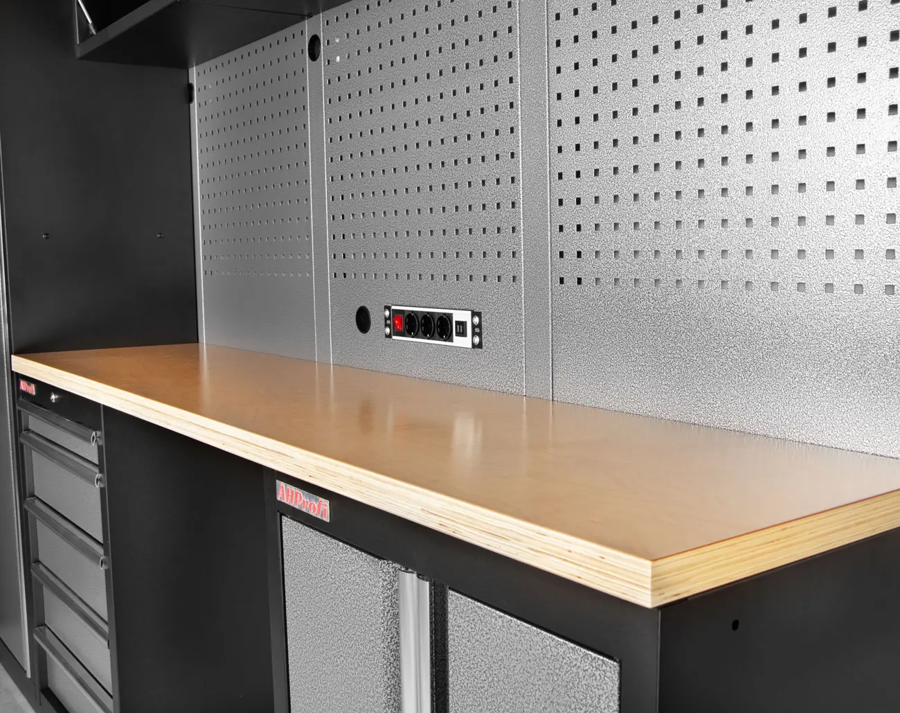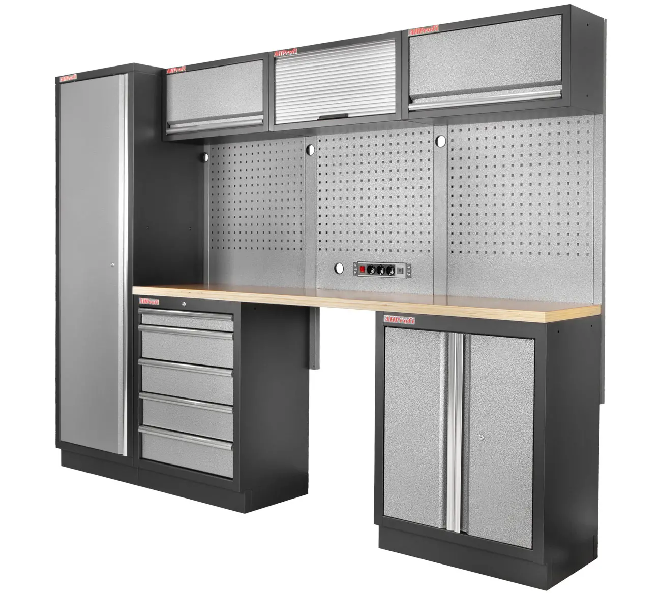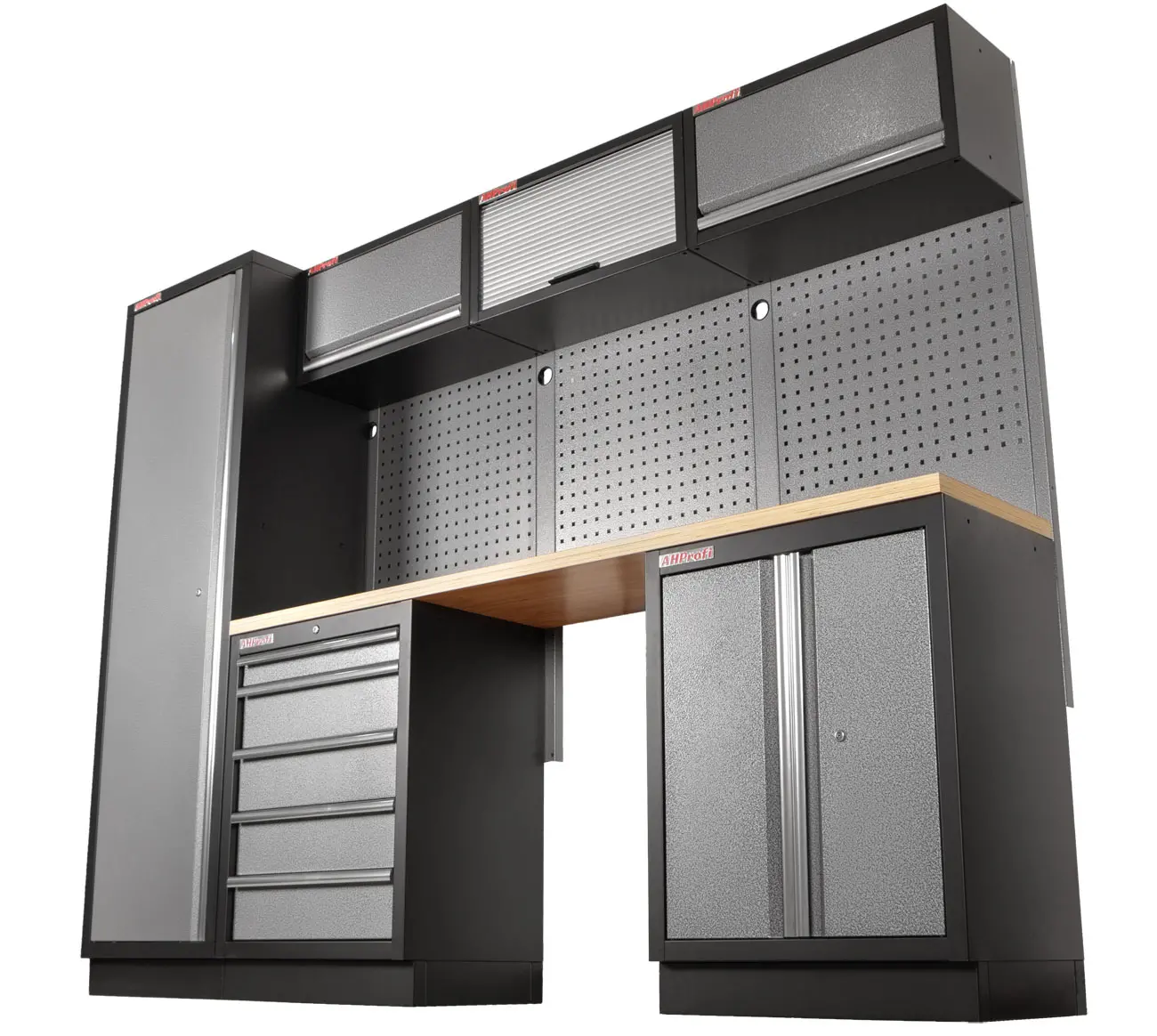 Zostava nábytku v sebe skrýva dostatočné množstvo úložného priestoru pre vaše náradie, autotechniku aj dielenské vybavenie. V kombinácii s pevnou pracovnou doskou získate multifunkčnú stenu, s ktorou vám pôjde práca od ruky vo všetkých smeroch.