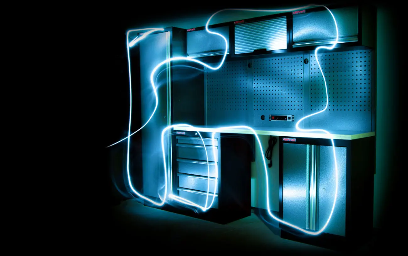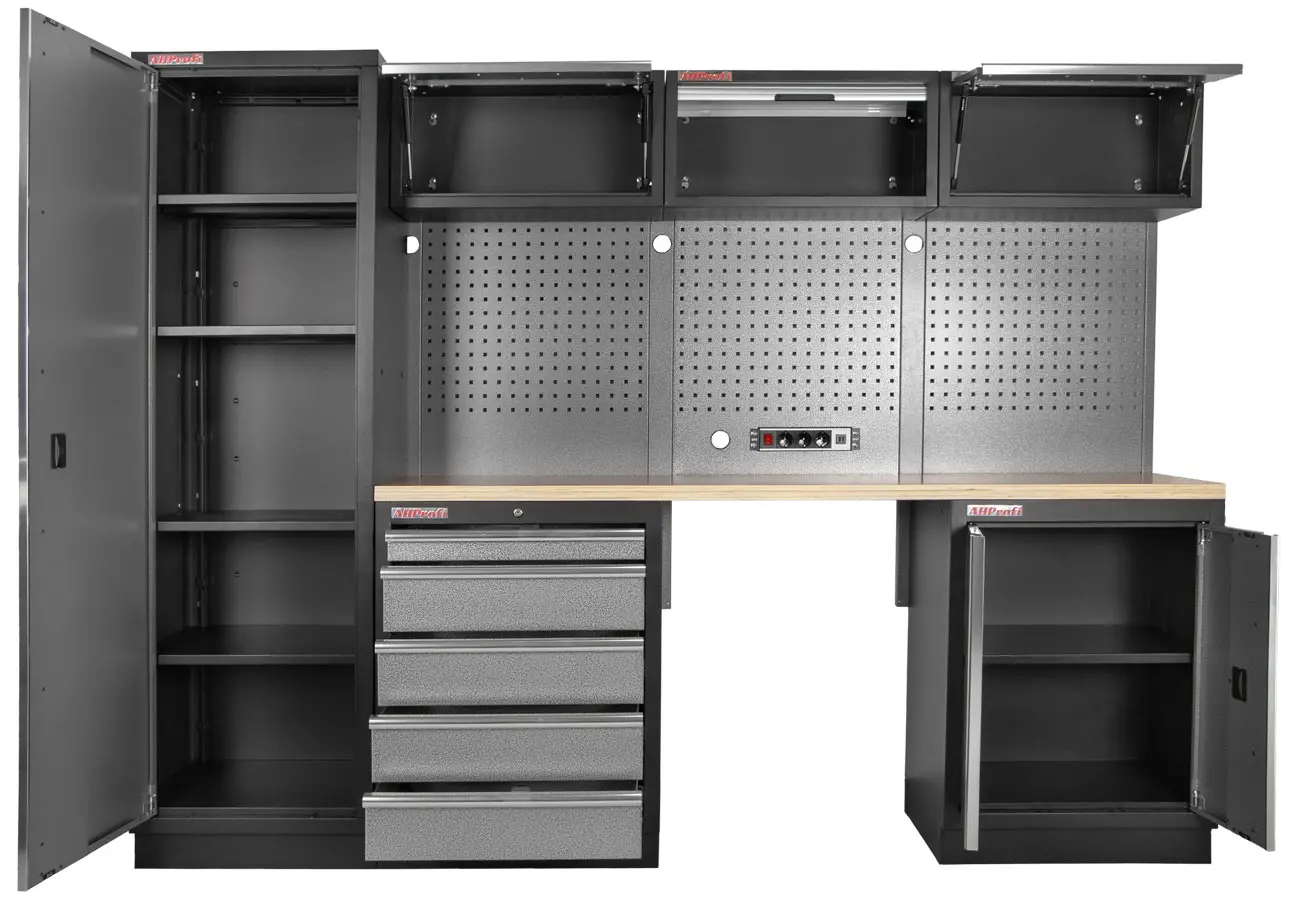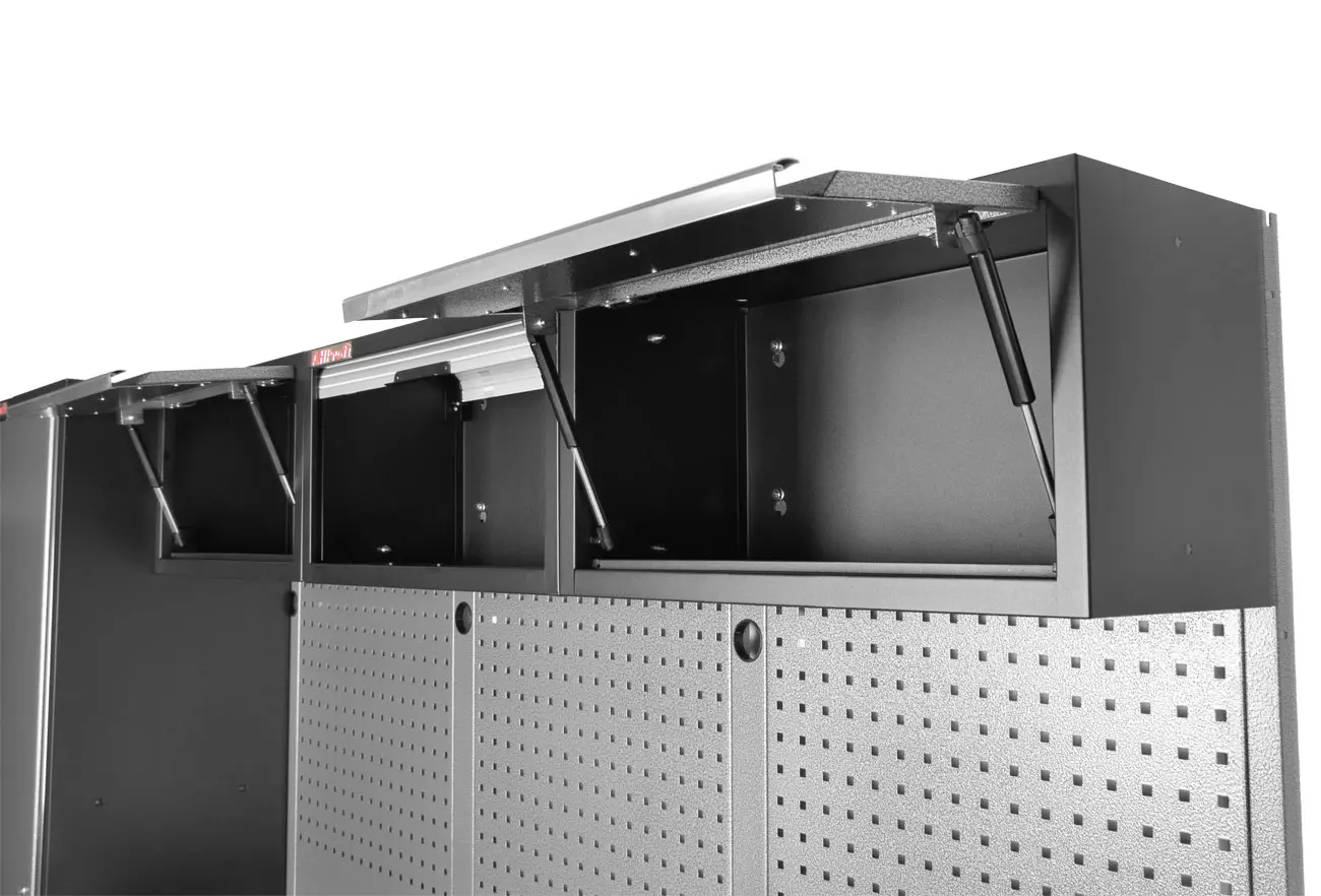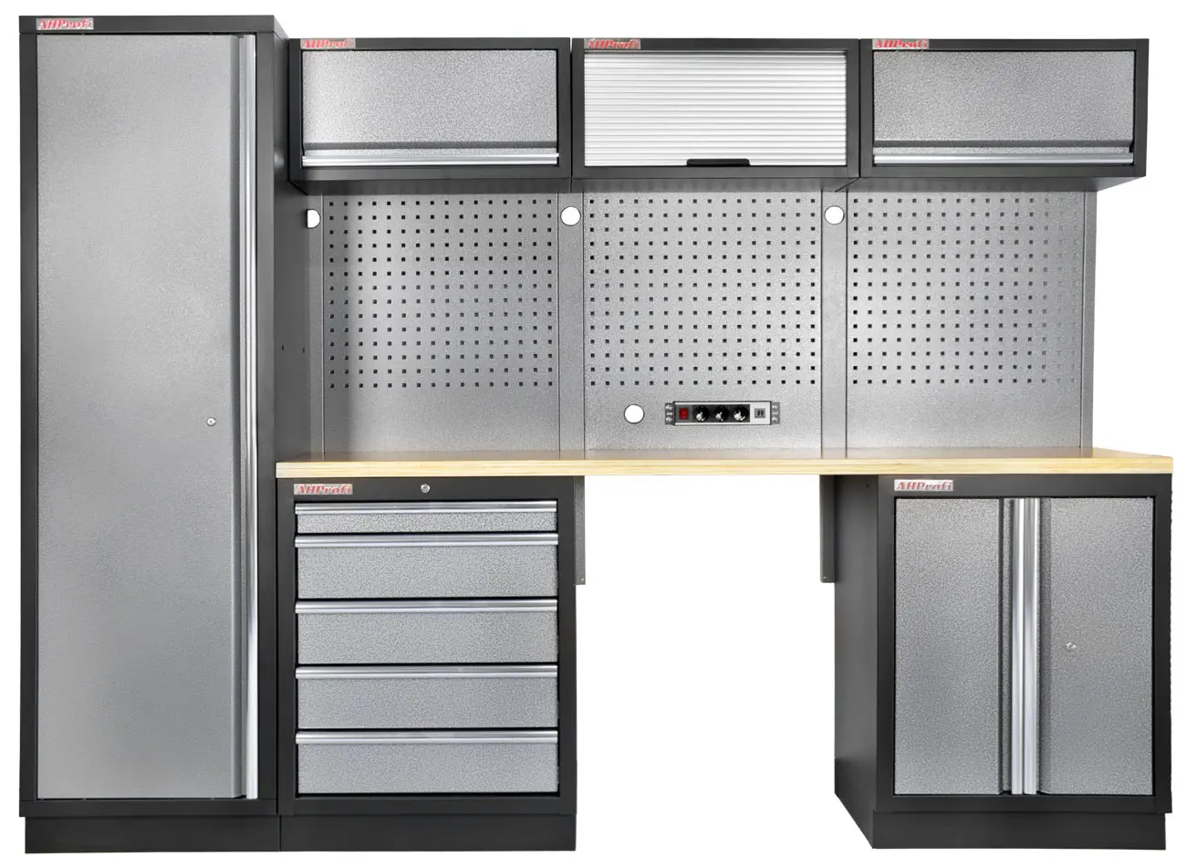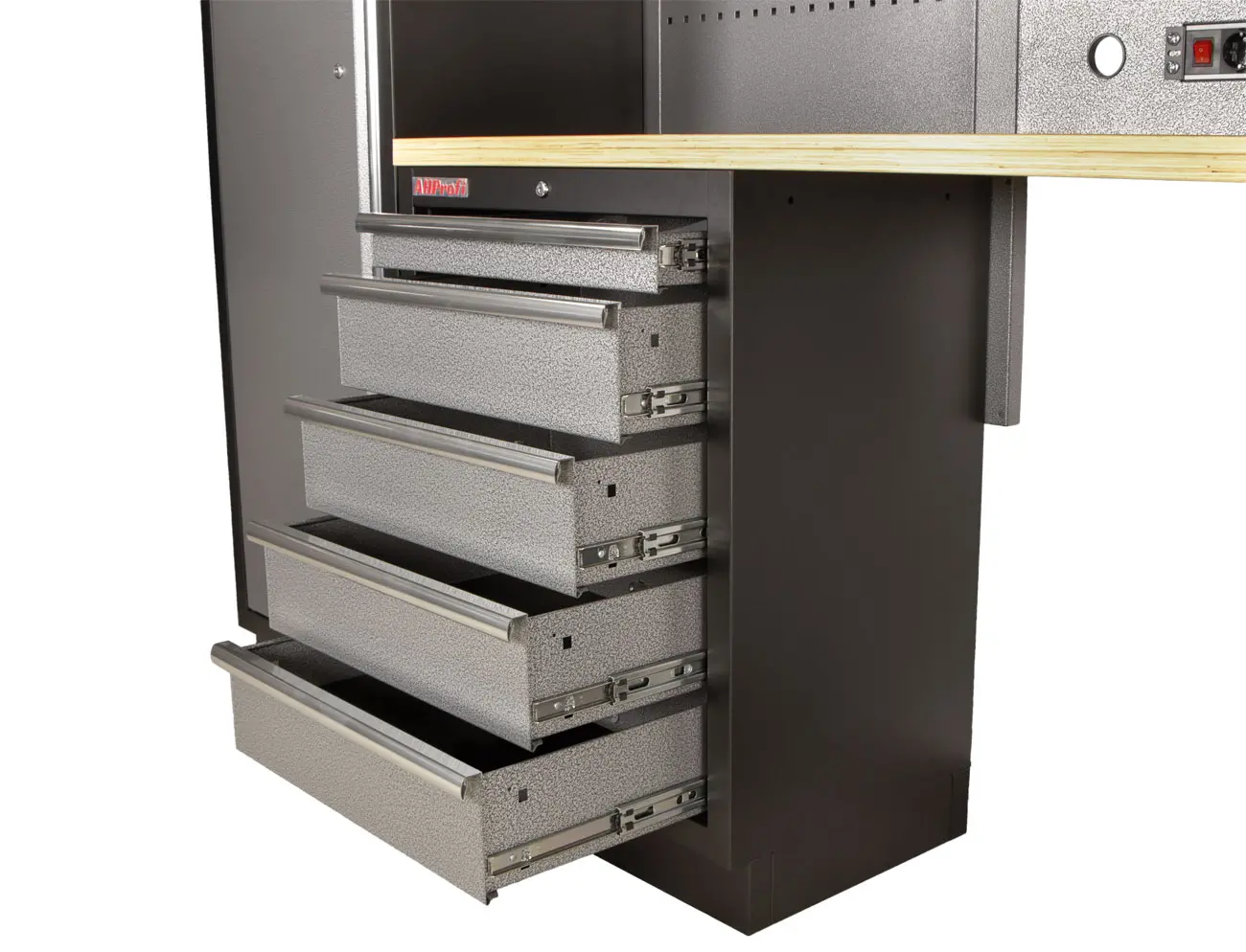 Zostava nábytku v sebe skrýva dostatočné množstvo úložného priestoru pre vaše náradie, autotechniku aj dielenské vybavenie. V kombinácii s pevnou pracovnou doskou získate multifunkčnú stenu, s ktorou vám pôjde práca od ruky vo všetkých smeroch.