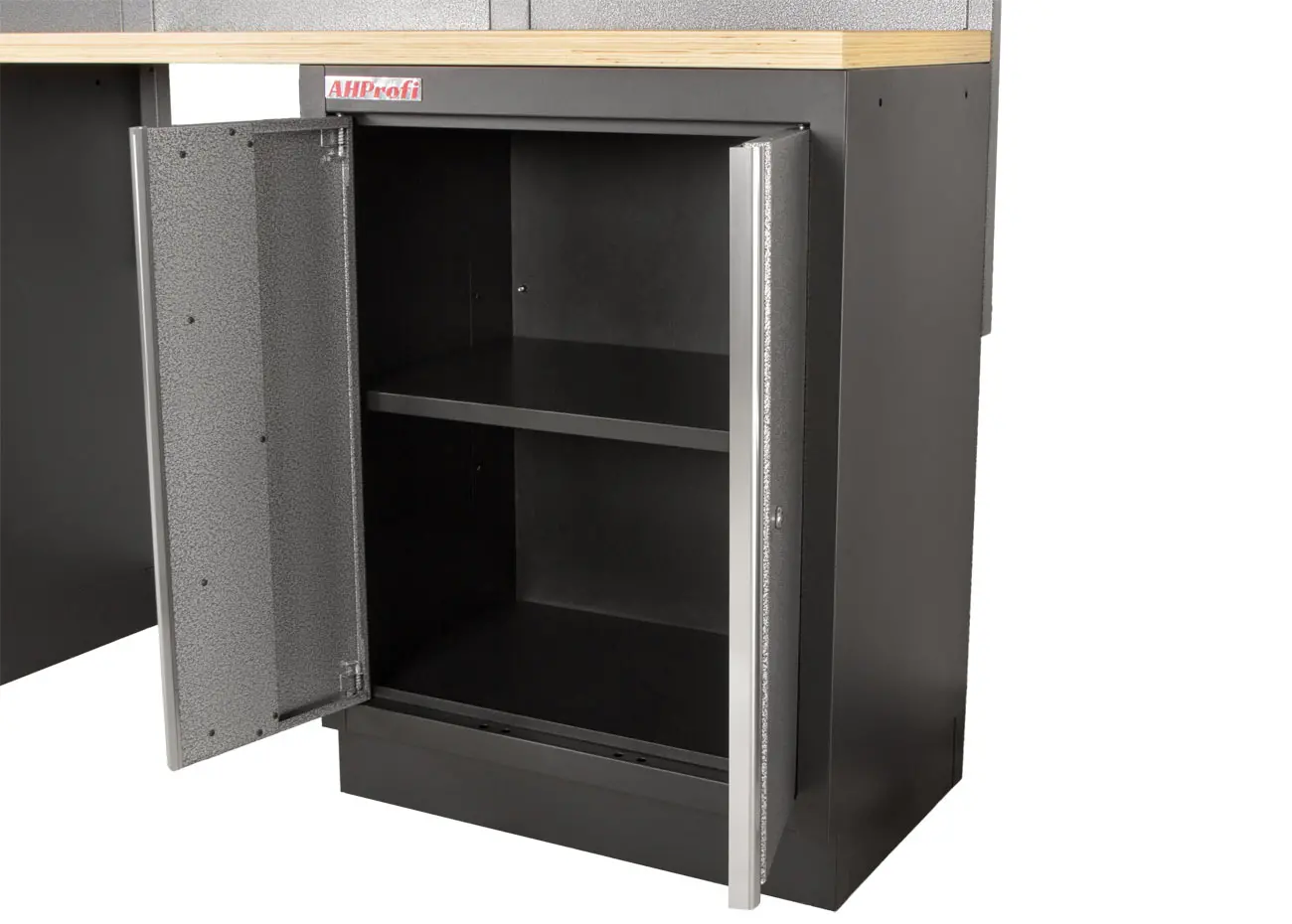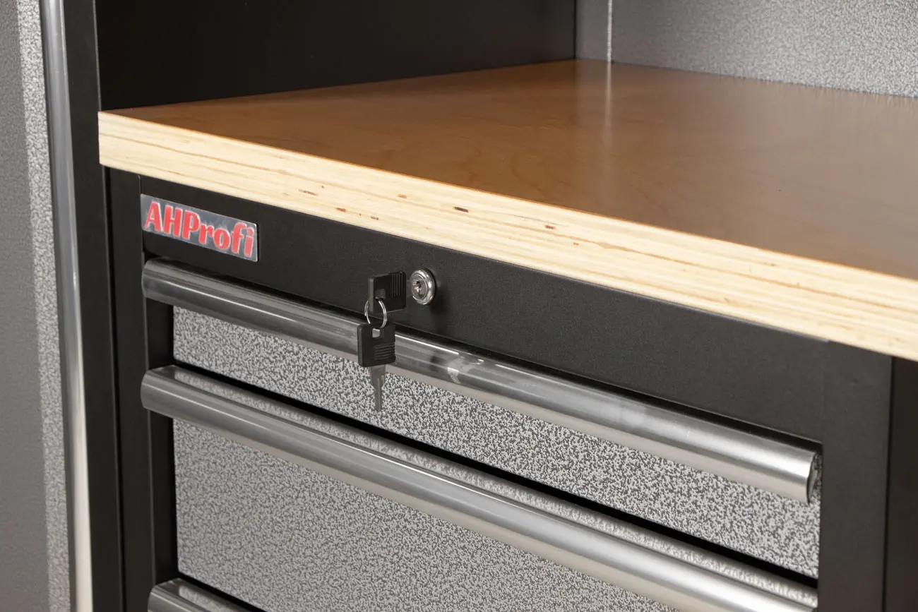 Dielenský nábytok PROFI GREY s drevenou doskou zaujme moderným a profesionálnym vzhľadom. Kombinácia kladivkovej sivej a čiernej RAL 9004 farby sa bude vynímať v každej garáži aj dielni.