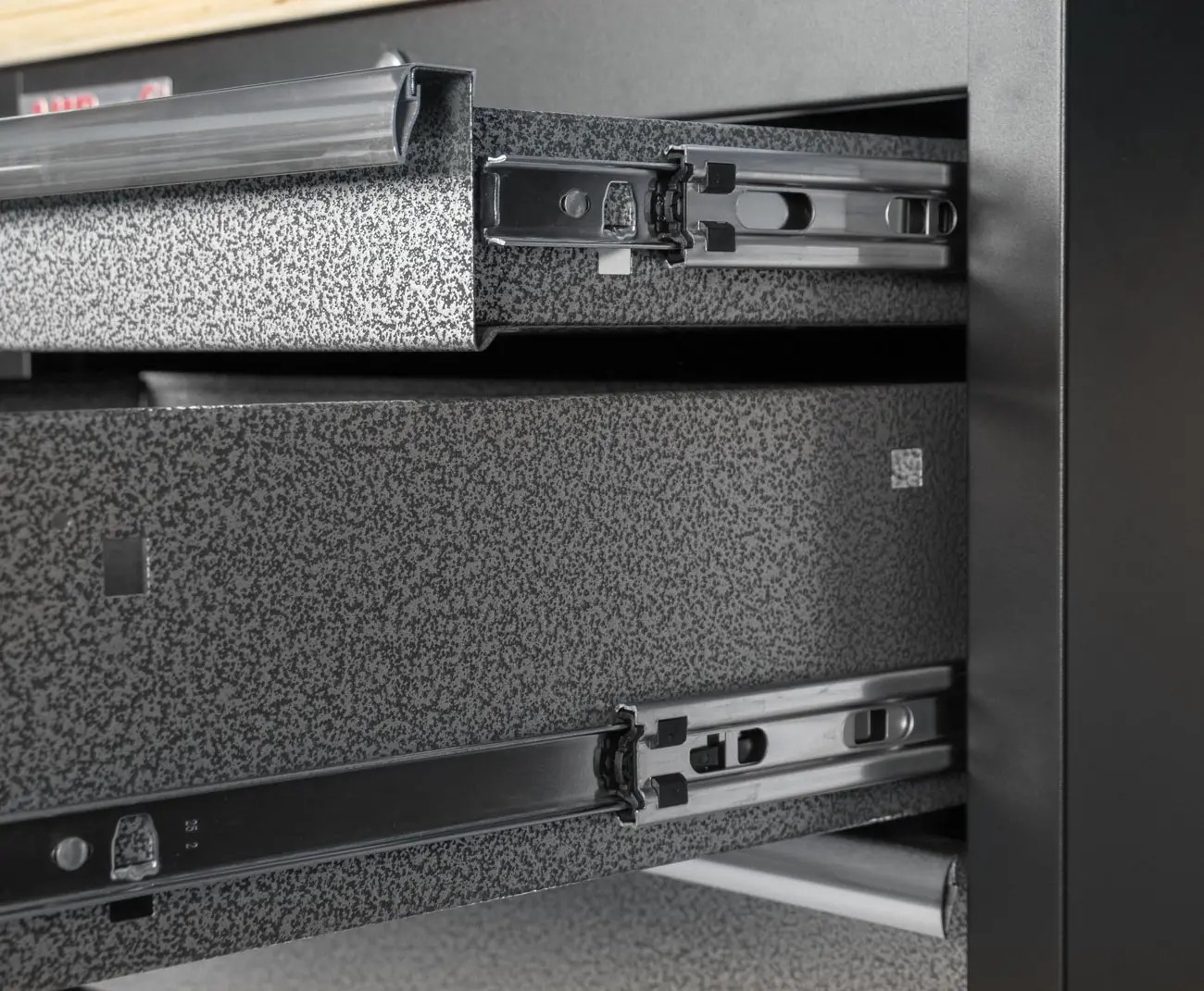 Zásuvky dielenského nábytku PROFI majú vysoko kvalitné pojazdy s guličkovými ložiskami, ktoré poskytujú plynulosť a presnosť pojazdu zásuviek aj pri plnom zaťažení. Max. nosnosť zásuvky je 30 kg.