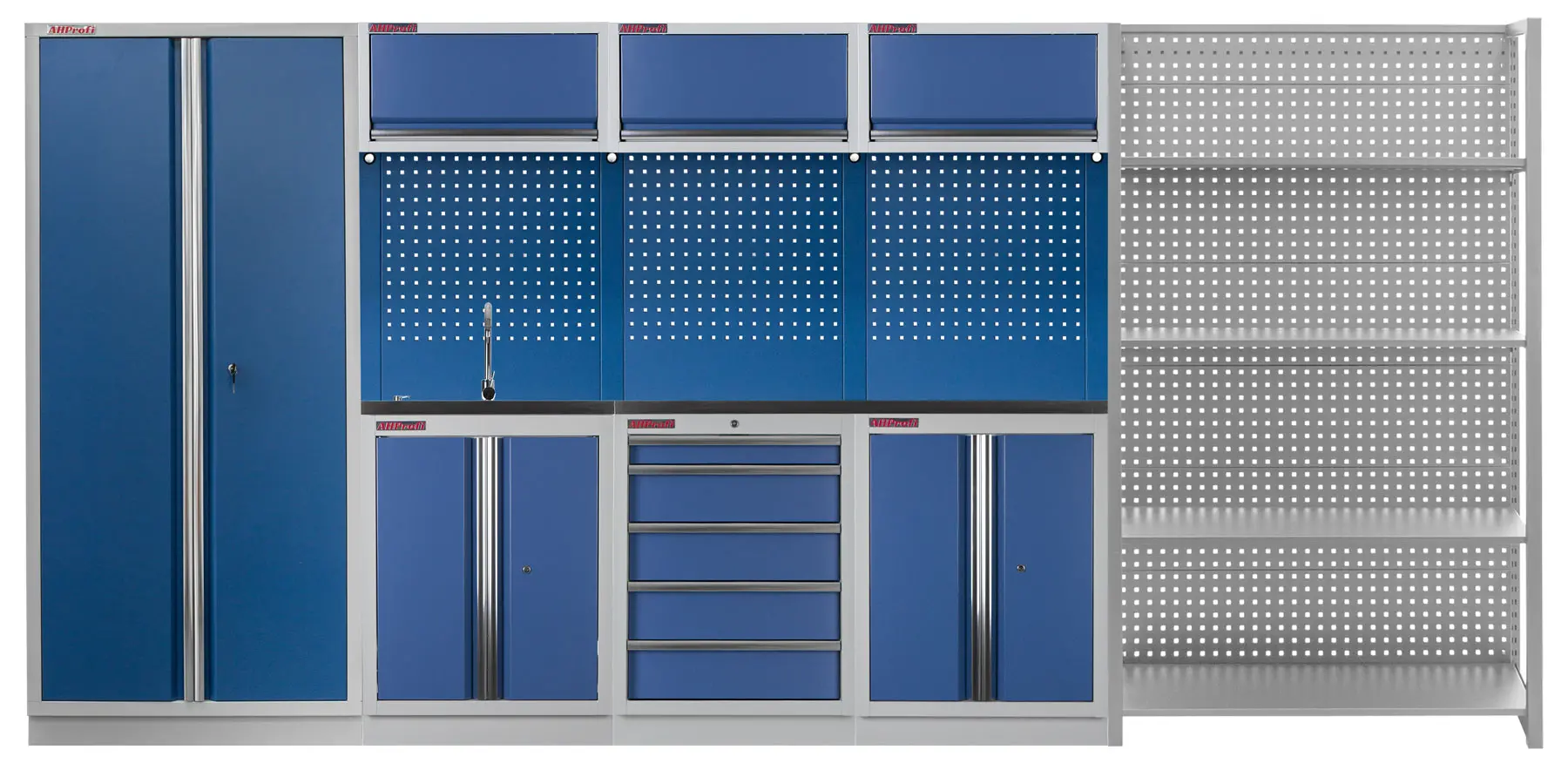 Zostava dielenského nábytku vo vysokej kvalite, ktorý je vhodný pre profesionálne servisy aj domáce garáže a dielne. Nábytok je celokovový s kovovou pracovnou doskou. Zostava 16 ks dielenského nábytku udrží náradie prehľadne upratané na správnom mieste.