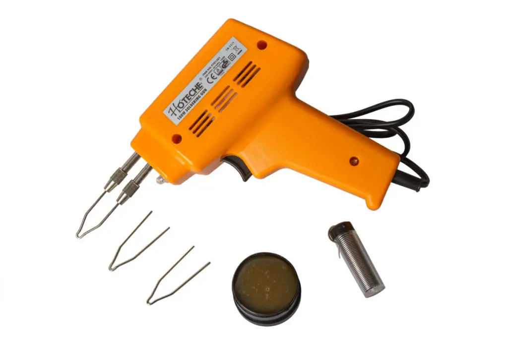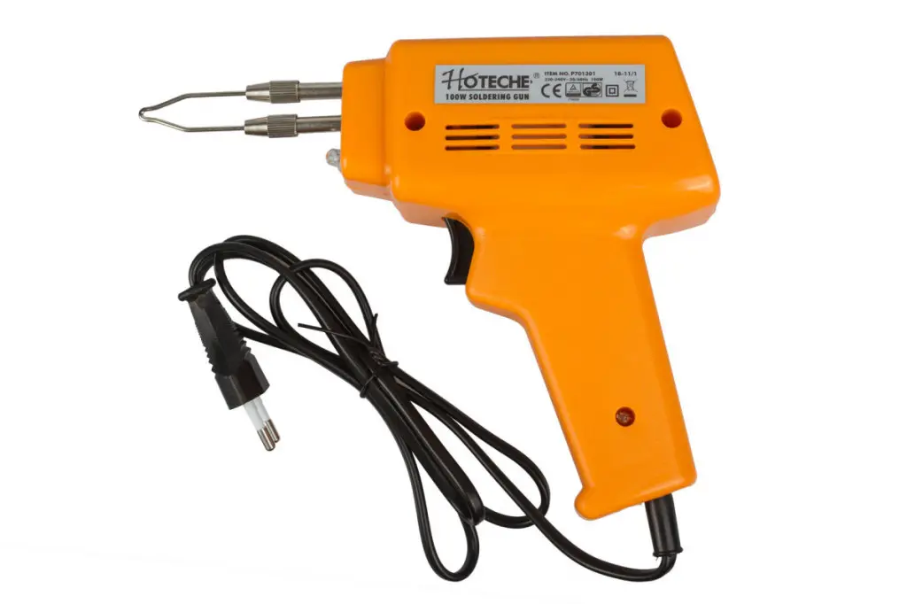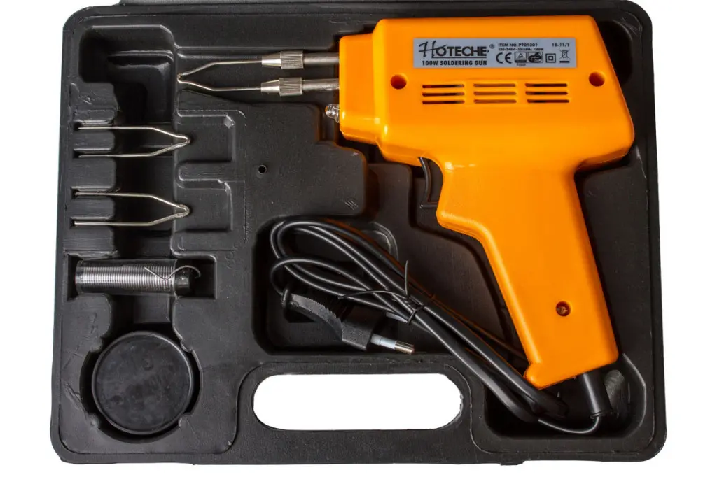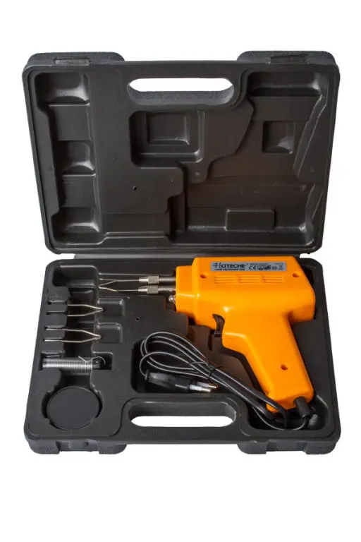 Pájka Hoteche 100 W v kufri pre všestranné použitie v elektrotechnike a dielni. Klasické prevedenie so žiarovkou na osvetlenie pracovnej plochy.