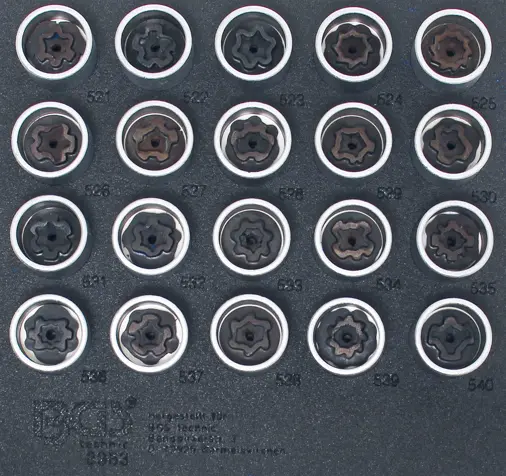 Sada 20 ks kľúčov v penovej výplni na kolesá VAG s bezpečnostným profilom je základom pre sňatie skrutiek a kolesa bez jeho poškodenia.